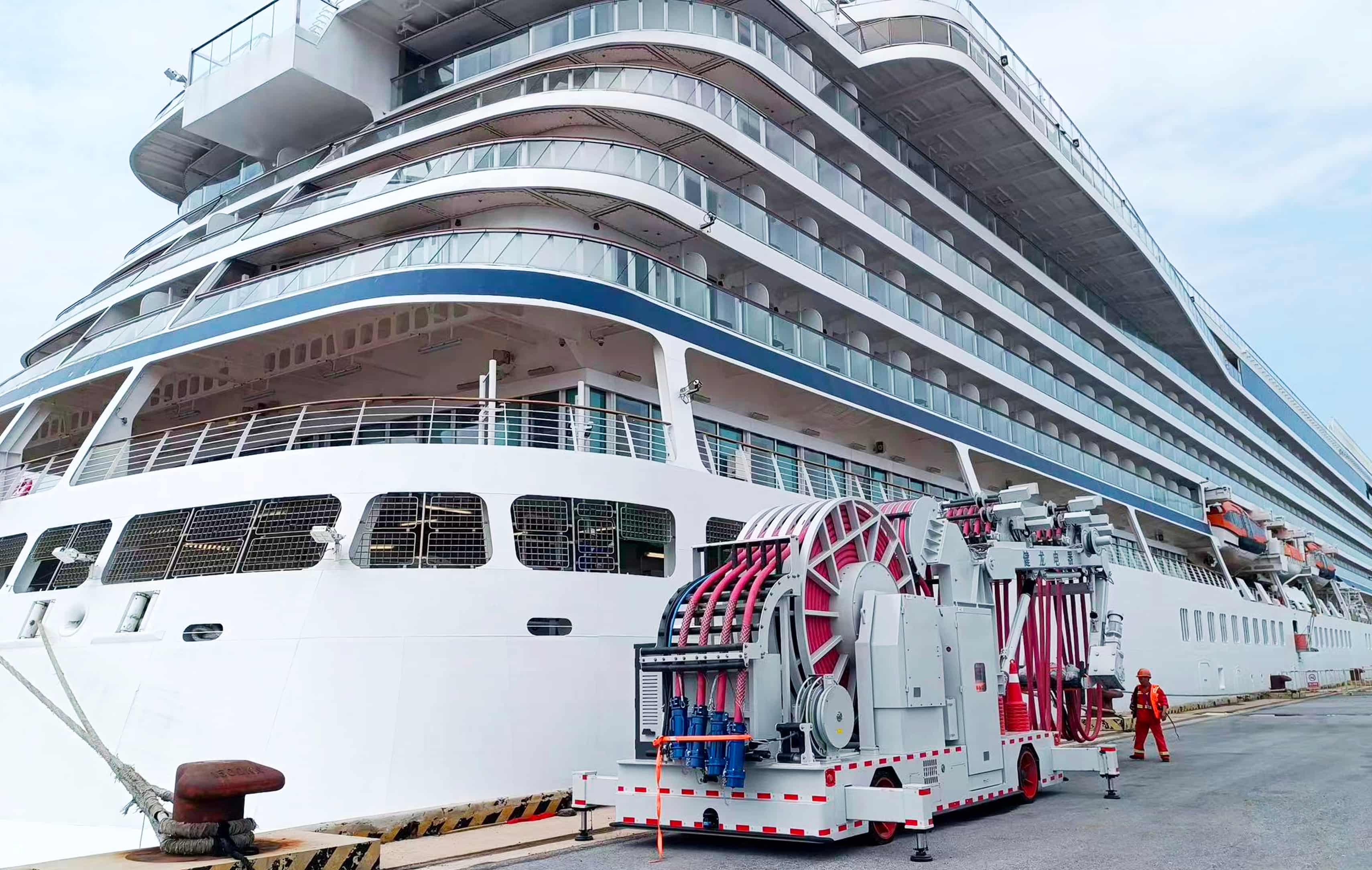 本項(xiàng)目是貫徹落實(shí)交通運(yùn)輸部《關(guān)于示范推進(jìn)國(guó)際航線集裝箱船舶和郵輪靠港使用岸電行動(dòng)方案(2023-2025年)》的一項(xiàng)重要舉措。系統(tǒng)采用高壓交-直-交變頻技術(shù),輸出容量可達(dá)16MVA,支持6.6kV/60Hz及11kV/60Hz雙電壓制式,能夠滿足全球主流大型郵輪的用電需求。該系統(tǒng)可有效替代船舶輔機(jī)發(fā)電,顯著降低碳排放與噪聲污染。